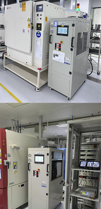 歐科隆應用于汽車行業三電系統測試冷水機,是非標定制的高低溫液冷沖擊機組,對服務器進行高低溫沖擊飽和性測試。